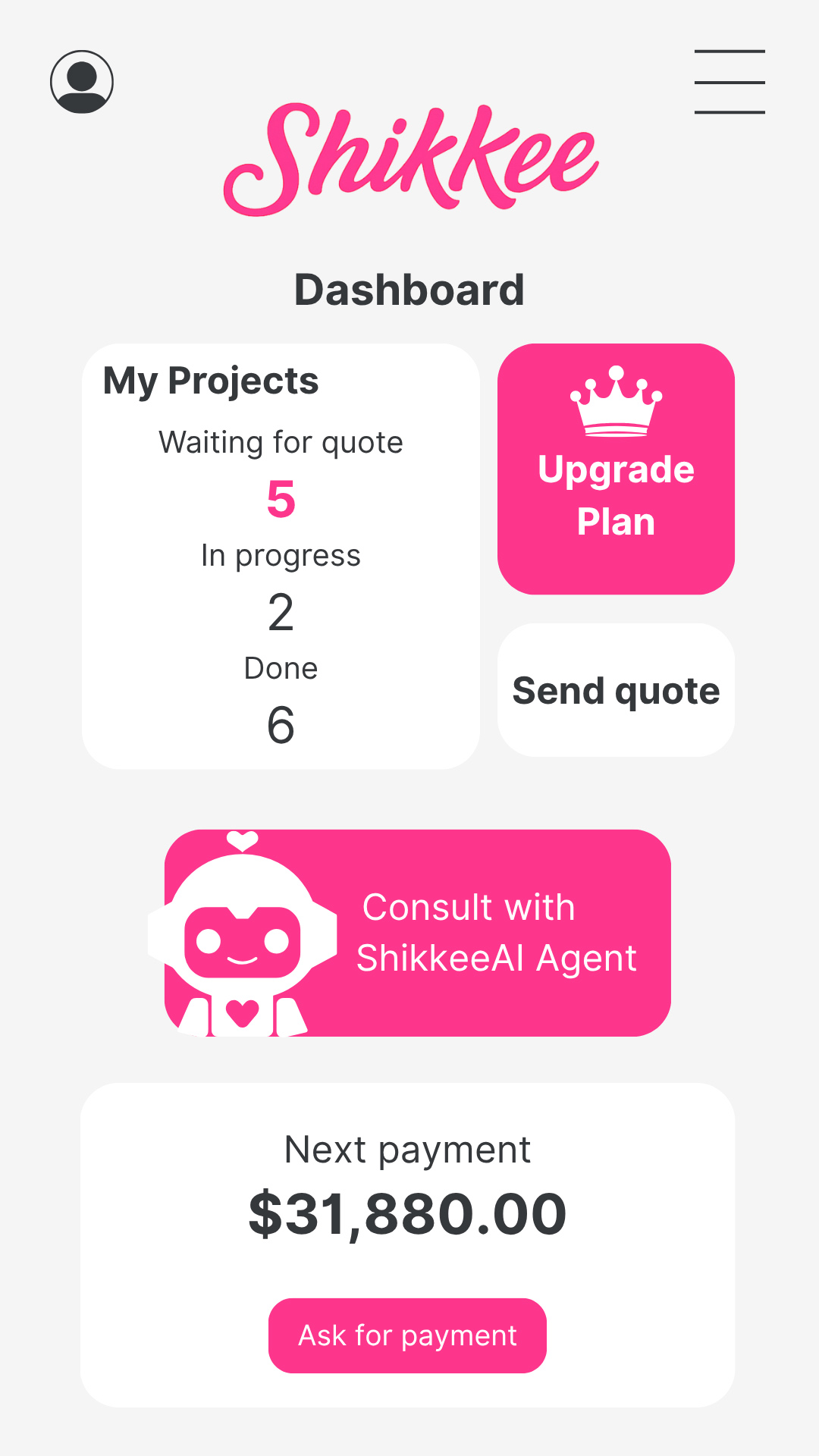 Your dashboard is your command center – all your projects are in one place: from open proposals to pending payments. Plus, ShikkeeAI is at your service with real-time answers, so you can work smarter and faster.